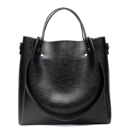 Spacious Black PU Tote Bag with Adjustable Strap and Compartments